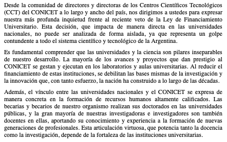 del CONICET a lo largo y ancho del país, nos dirigimos a ustedes para expresar nuestra más